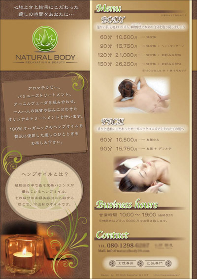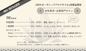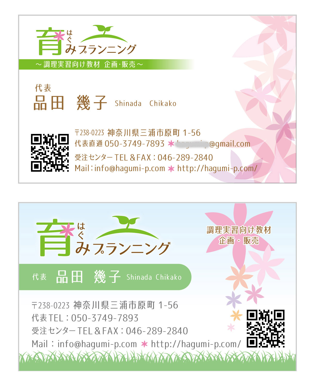女性らしさ、優しさをイメージした個人のアドレス入りのものと、サイトデザインに合わせたショップ情報のみ掲載の2デザイン。